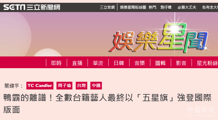 臺(tái)灣親綠媒體“三立新聞網(wǎng)”先報(bào)道了“TC Candler”公布的“亞太區(qū)百大最美臉孔排行榜”中上榜的臺(tái)灣地區(qū)男女藝人,包括彭于晏、周杰倫、周子瑜、歐陽娜娜等,并特別提及,去年第2名的周子瑜,今年輸給了大陸女星楊超越。