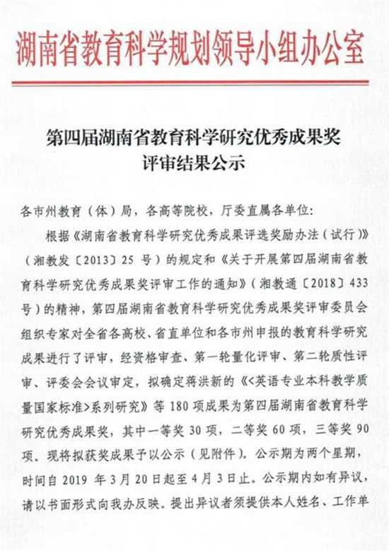 湖南省教育科學研究優(yōu)秀成果獎,由省教育廳組織,省教育科學規(guī)劃領(lǐng)導小組辦公室具體負責。每4年評審一次,共設(shè)決策咨詢獎、理論創(chuàng)新獎和實踐探索獎三個獎項,成果類別分為專著(論文類)、編著類、調(diào)研類三類。在經(jīng)歷資格審查、量化評審、質(zhì)性評審、評委會會議評審等四輪嚴格評選后,《營造一方純粹的教育生態(tài)——邵東縣“純粹教育”的實踐與思考》從410多項申報成果中脫穎而出,榮獲一等獎。本次共設(shè)一等獎30項,其中湖南大學等高等院校21項,基礎(chǔ)教育9項。