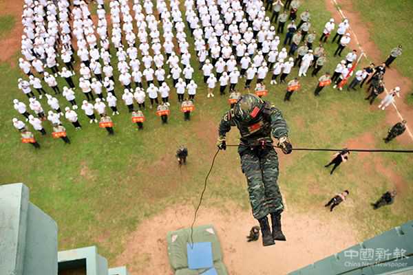 武警特戰(zhàn)隊員展示樓房索降。李華 攝
