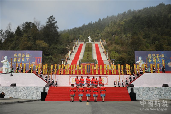 2019己亥年中國(guó)宣恩伍家臺(tái)貢茶先祖拜謁大典活動(dòng)現(xiàn)場(chǎng)以宣恩當(dāng)?shù)貍鹘y(tǒng)的“喊山”儀式開場(chǎng),原生態(tài)鄂西高腔演繹的山歌,盡顯土家民族特色。從全國(guó)選拔出來的貢茶七仙子以茶為媒,獻(xiàn)禮迎賓,她們用優(yōu)美的舞姿,為賓客奉上一杯杯翠綠清香的新茶,向全國(guó)賓客發(fā)出來自宣恩的邀請(qǐng)!隨后,拜祖儀程正式開始,由土家祭師梯瑪主持。首先幡旗方陣入場(chǎng),奉祀樂舞《茅古斯》和奉祀祝詞表演結(jié)束后,八位伍氏傳人為貢茶先祖上香、敬茶;宣恩當(dāng)?shù)刂驹刚咄ㄟ^三獻(xiàn)禮,向貢茶先祖奉上了五谷、苞谷酒和土家刺繡品西蘭卡普;接著由伍昌臣后人代表,土、苗、漢族青年學(xué)子,手持長(zhǎng)卷集體誦讀《誦茶祖文》,祭拜儀式圓滿完成。此次拜祖儀程規(guī)模宏大,莊嚴(yán)肅穆,重塑了伍昌臣“貢茶先祖”的歷史地位,擦亮了宣恩貢茶名片。