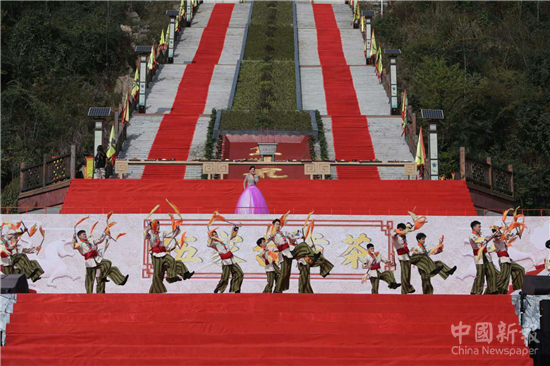 在最后的歌舞唱頌環(huán)節(jié)中,祭祀舞蹈《八寶銅鈴舞》保留了土家傳統(tǒng)民俗文化,彰顯民族民間特色;歌舞表演《請(qǐng)喝一杯宣恩茶》蘊(yùn)含春茶的清香,散發(fā)濃郁的土苗風(fēng)情。壓軸表演是由數(shù)百名連廂傳承人和舞蹈演員一起,用宣恩省級(jí)非物質(zhì)文化遺產(chǎn)——連廂的表演形式,祈福宣恩,祝福茶鄉(xiāng),共圓浪漫宣恩騰飛夢(mèng)!此次拜謁大典,通過傳統(tǒng)祭拜、歌舞唱頌的形式,描繪了宣恩發(fā)展藍(lán)圖,展望宣恩發(fā)展愿景,祝福茶鄉(xiāng),祝愿實(shí)現(xiàn)宣恩夢(mèng)。