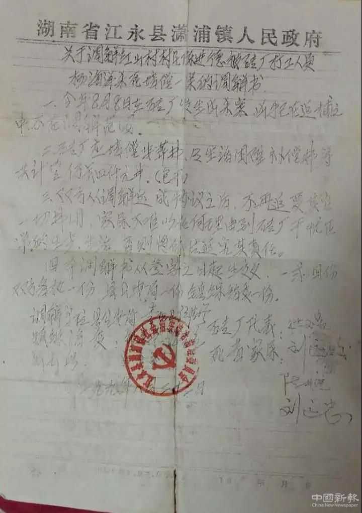 這份簽署于1998年8月22日、加蓋有江永縣瀟浦鎮(zhèn)社會治安綜合治理委員會公章的調(diào)解書上,記載有以下簽名:調(diào)解單位江永縣公安局、城關(guān)派出所、瀟浦鎮(zhèn)綜治委等相關(guān)機(jī)構(gòu)的負(fù)責(zé)人,磚廠代表,以及死者妻子劉運(yùn)嬌、死者哥哥陳井進(jìn)、死者的大舅哥劉運(yùn)中。