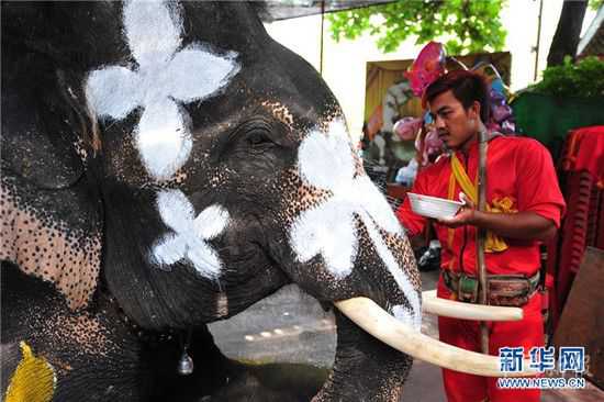 4月11日,在泰國(guó)大城府舉行的慶祝活動(dòng)上,一名象夫?yàn)榇笙筮M(jìn)行彩繪。 當(dāng)日,泰國(guó)古都大城府舉行慶?;顒?dòng),迎接即將到來的泰歷新年“宋干節(jié)”。 新華社發(fā)(拉亨攝)