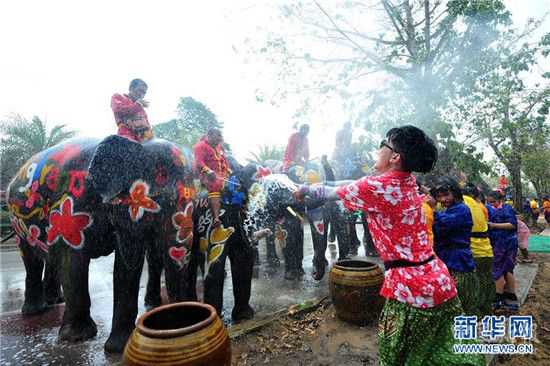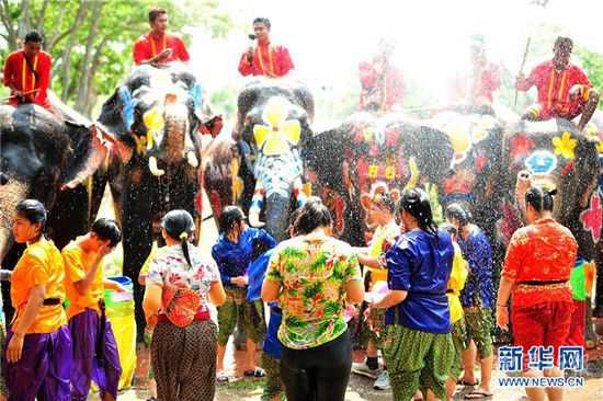 4月11日,在泰國(guó)大城府舉行的慶?;顒?dòng)上,大象向游客噴水。 當(dāng)日,泰國(guó)古都大城府舉行慶?;顒?dòng),迎接即將到來的泰歷新年“宋干節(jié)”。 新華社發(fā)(拉亨攝)