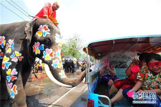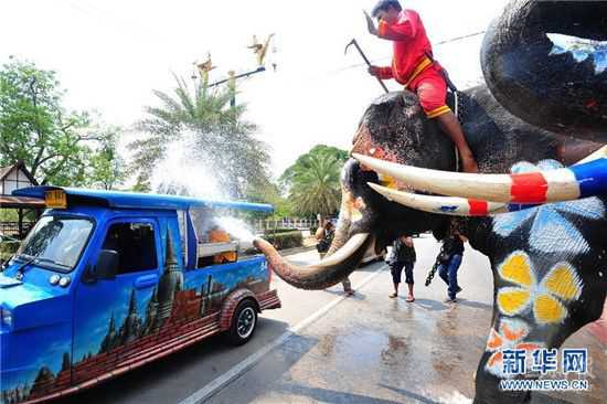 4月11日,在泰國(guó)大城府舉行的慶?;顒?dòng)上,大象向車上的游客噴水。 當(dāng)日,泰國(guó)古都大城府舉行慶?;顒?dòng),迎接即將到來的泰歷新年“宋干節(jié)”。 新華社發(fā)(拉亨攝)