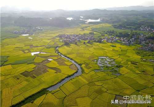 7月27日,航拍廣西羅城仫佬族自治縣小長(zhǎng)安鎮(zhèn)雙蒙村覃村屯一帶,3500多畝成熟的富硒稻田,一片金黃,美不勝收。農(nóng)房、樹(shù)木、遠(yuǎn)山與一望金黃的稻田完美“組合”,多姿多彩,如詩(shī)如畫(huà),成了一幅壯麗的田園畫(huà)卷。中新社發(fā) 蒙增師 攝