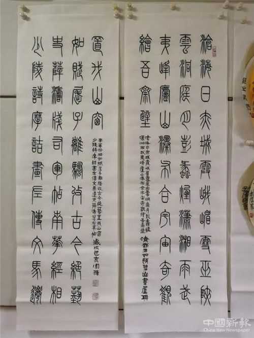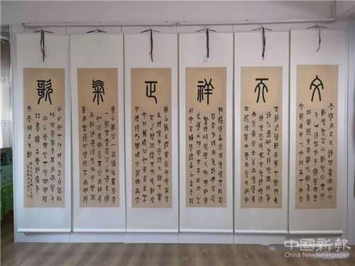 周強(qiáng)書法以篆書為主,諸體兼修,書寫的作品使人獲得雙重的美感享受。小篆用筆遒婉流暢,體勢頎長,結(jié)字工整規(guī)范。大篆具有遒勁凝重的風(fēng)格。