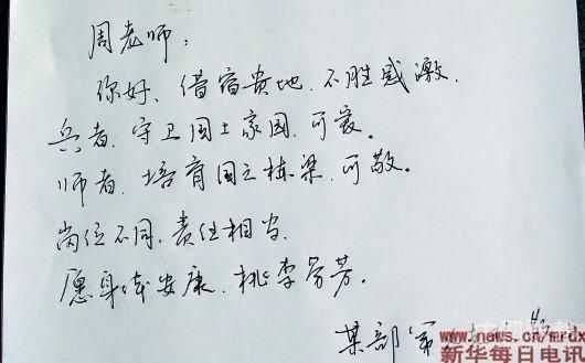 第二天早上,周老師趕到學(xué)校,發(fā)現(xiàn)辦公室里干凈整齊,如同原樣。他沒有見到武警官兵,只是白紙上多了一段“回復(fù)”:“周老師,你好,借宿貴地,不勝感激。兵者,守衛(wèi)國(guó)土家園,可愛。師者,培育國(guó)之棟梁,可敬。崗位不同,責(zé)任相當(dāng)。愿身體安康,桃李芬芳。某部第某支隊(duì)敬上。”