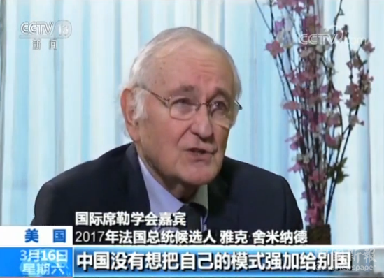 國際席勒學(xué)會(huì)嘉賓 2017年法國總統(tǒng)候選人 雅克·舍米納德:中國模式提倡通過共同發(fā)展實(shí)現(xiàn)全球融合,習(xí)近平主席所說的合作共贏,這是人類的未來。中國沒有想把自己的模式強(qiáng)加給別國,中國也不接受別國強(qiáng)加的發(fā)展模式。