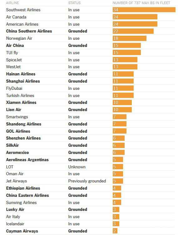 截至3月12日,擁有737-8的航空公司以及其數(shù)量統(tǒng)計(jì) 來源:《紐約時(shí)報(bào)》