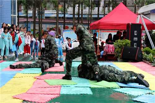 當(dāng)天,武警官兵們除了組織了升國(guó)旗儀式,通過互動(dòng)的方式,給孩子們傳授國(guó)防知識(shí),孩子們?cè)谖渚俦闹笓]中下,一起高唱國(guó)歌,還向小朋友們展示了擒敵表演,引來小朋友們的陣陣掌聲和喝彩。