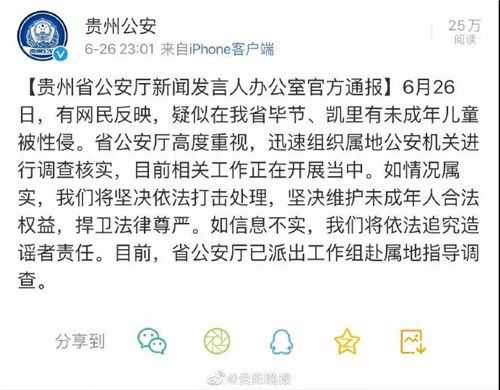 貴州省公安廳官方微博賬號(hào) " 貴州公安 " 通報(bào):“6 月26日,有網(wǎng)民反映,疑似在我省畢節(jié)、凱里有未成年兒童被性侵。省公安廳高度重視,迅速組織屬地公安機(jī)關(guān)進(jìn)行調(diào)查核實(shí),目前相關(guān)工作正在開展當(dāng)中。如情況屬實(shí),我們將堅(jiān)決依法打擊處理,堅(jiān)決維護(hù)未成年人合法權(quán)益,捍衛(wèi)法律尊嚴(yán)。如信息不實(shí),我們將依法追究造謠者責(zé)任。目前,省公安廳已派出工作組赴屬地指導(dǎo)調(diào)查。”