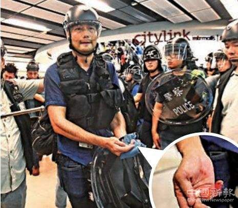 7月14日,梁警官在沙田新城市廣場內(nèi)執(zhí)行任務(wù)時(shí),被一名暴徒咬斷無名指第一節(jié)整段,不能確定未來恢復(fù)情況。圖片來源:大公文匯網(wǎng)