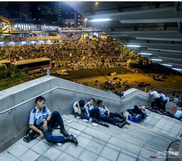 一位香港警察說,穿防暴服上街,背著三四十磅重的裝備,最長連續(xù)30個小時(shí)跟暴徒對峙,累了就睡馬路,睡坑渠邊,拿些破爛的塑料路障、紙皮箱墊著當(dāng)枕頭。