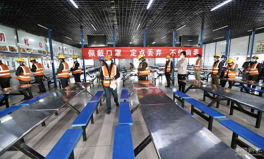 施工工人在食堂間隔一米排隊(duì)打飯。(中國(guó)日?qǐng)?bào)記者 鄒紅 攝)