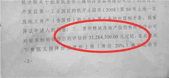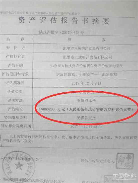 據(jù)三辣明洋公司提供的資料,該公司曾委托陜西一家評(píng)估公司對(duì)該公司原廠區(qū)的土地和房產(chǎn)進(jìn)行評(píng)估,評(píng)估結(jié)論為,它們的價(jià)值高達(dá)5900多萬(wàn)元,但黔東南州中級(jí)法院未采信這份評(píng)估報(bào)告。