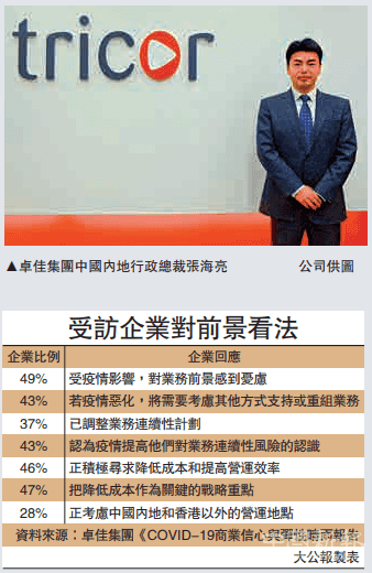 提供綜合商務(wù)服務(wù)的卓佳集團(tuán)(Tricor)最近發(fā)布《COVID-19商業(yè)信心與彈性晴雨報(bào)告》,探討在疫情下的企業(yè)信心,在今年2月份針對(duì)亞太區(qū)12個(gè)主要行業(yè),訪(fǎng)問(wèn)逾千家企業(yè)管理層,包括初創(chuàng)、中小企、跨國(guó)公司、上市公司等。其中,有49%受訪(fǎng)者認(rèn)為業(yè)務(wù)受到疫情影響,同時(shí)對(duì)公司業(yè)務(wù)的未來(lái)發(fā)展感到憂(yōu)慮。此外,43%受訪(fǎng)者直言,倘若疫情持續(xù)惡化,他們會(huì)考慮進(jìn)行業(yè)務(wù)重組,或會(huì)到其他地方進(jìn)行投資,例如東南亞或成本較低的地區(qū)。