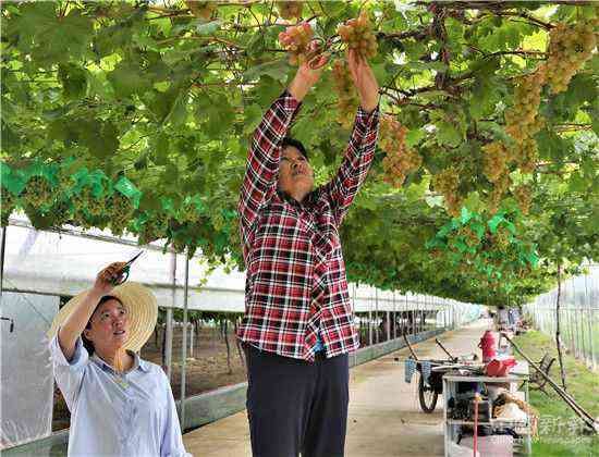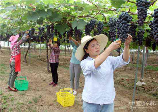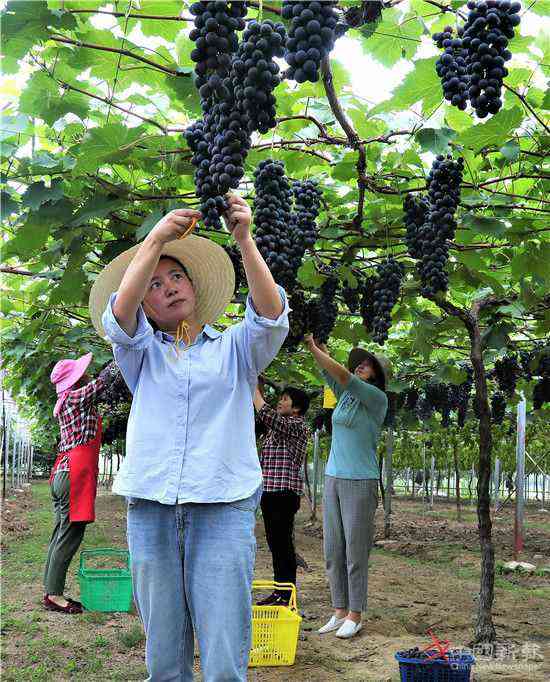 (圖為2020年7月15日,徐云麗正和員工們一道在采摘黑珍珠提子。)