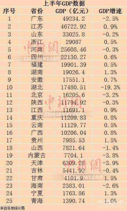 廣東上半年GDP為49234.20億元,同比下降2.5%;江蘇上半年GDP為46722.92億元,同比增長(zhǎng)0.9%;山東上半年GDP為33025.8億元,同比下降0.2%。