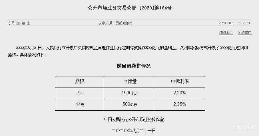 據(jù)央行網(wǎng)站21日消息,央行公告稱,8月21日在開展中央國庫現(xiàn)金管理商業(yè)銀行定期存款操作500億元的基礎(chǔ)上,以利率招標方式開展了2000億元逆回購操作。包括1500億元7天期和500億元14天期,中標利率分別為2.20%和2.35%,均與上次持平。