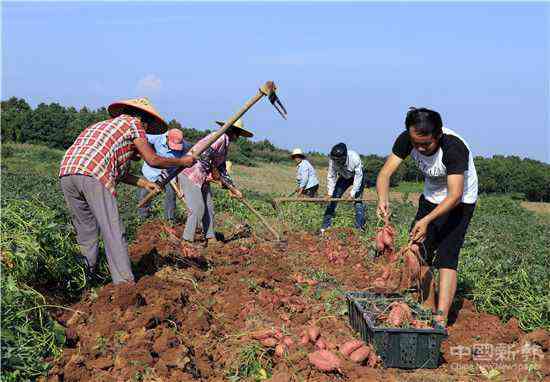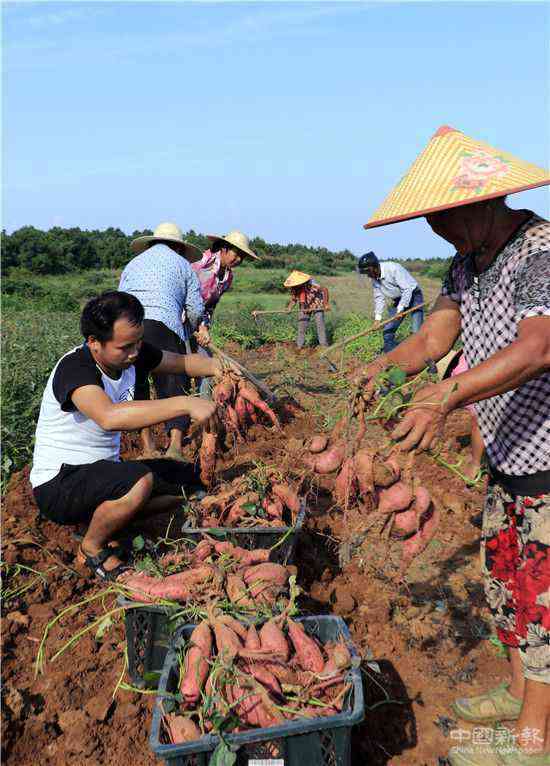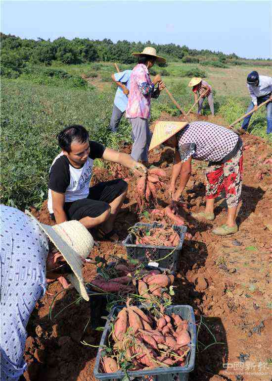中國(guó)新報(bào)(特約記者 巢志斌 攝影報(bào)道)2020年9月5日,安徽省合肥市廬江縣白湖鎮(zhèn)陶沖村蛋黃薯種植基地,村民們正在采收西瓜紅紅薯。