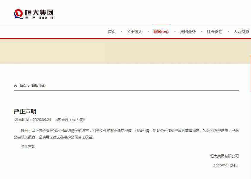 恒大集團(tuán)官網(wǎng)聲明截圖