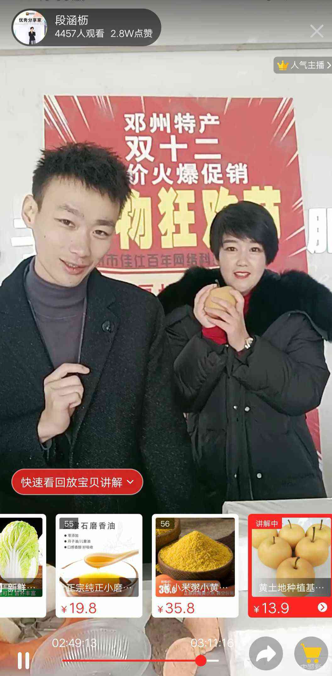 中國(guó)新報(bào)(特約記者 賀文生 通訊員 武 爽)“這是咱們鄧州的本地特產(chǎn)小磨油,起源于明末清初,距今有120多年的歷史,它采用當(dāng)?shù)貎?yōu)質(zhì)的芝麻精制而成,其工藝歷史悠久,技藝精湛,選料考究,品質(zhì)上乘,顏色透亮清澈,美味可口,營(yíng)養(yǎng)豐富,是家中常備的一種調(diào)味品,用它來(lái)炒菜涼拌煮湯,味道都非常不錯(cuò)......”12月12日,以“助農(nóng)扶農(nóng),直播帶貨”為主題的迎戰(zhàn)雙十二、共圓致富夢(mèng)活動(dòng)正式拉開(kāi)序幕,商家們和主播一起通過(guò)手機(jī)直播帶貨。