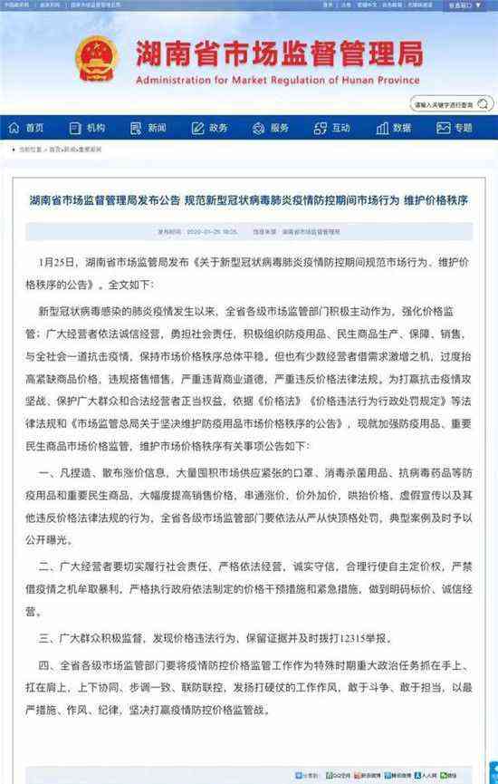 中國(guó)新報(bào)從湖南省市場(chǎng)監(jiān)督管理局獲悉,該局已最新發(fā)布《關(guān)于新型冠狀病毒肺炎疫情防控期間規(guī)范市場(chǎng)行為、維護(hù)價(jià)格秩序的公告》,將頂格處罰囤積、抬價(jià)銷(xiāo)售口罩等不法商業(yè)行為。同時(shí)指出,對(duì)大量囤積市場(chǎng)供應(yīng)緊張的口罩、消毒殺菌用品、抗病毒藥品等防疫用品和重要民生商品,大幅度提高銷(xiāo)售價(jià)格,串通漲價(jià),價(jià)外加價(jià),哄抬價(jià)格,虛假宣傳以及其他違反價(jià)格法律法規(guī)的行為,全省各級(jí)市場(chǎng)監(jiān)管部門(mén)要依法從嚴(yán)從快頂格處罰,典型案例及時(shí)予以公開(kāi)曝光。
