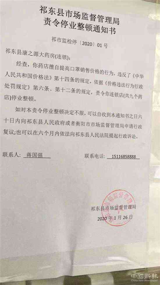 1月27日,康之源大藥房門(mén)店外貼出祁東縣市場(chǎng)監(jiān)督管理局停業(yè)整頓通知書(shū),根據(jù)通知書(shū)內(nèi)容顯示,康之源大藥房擅自提高口罩銷(xiāo)售價(jià)被責(zé)令停業(yè)整頓,停業(yè)整頓的包括康之源大藥房九家連鎖門(mén)店。落款日期則顯示為1月26日。
