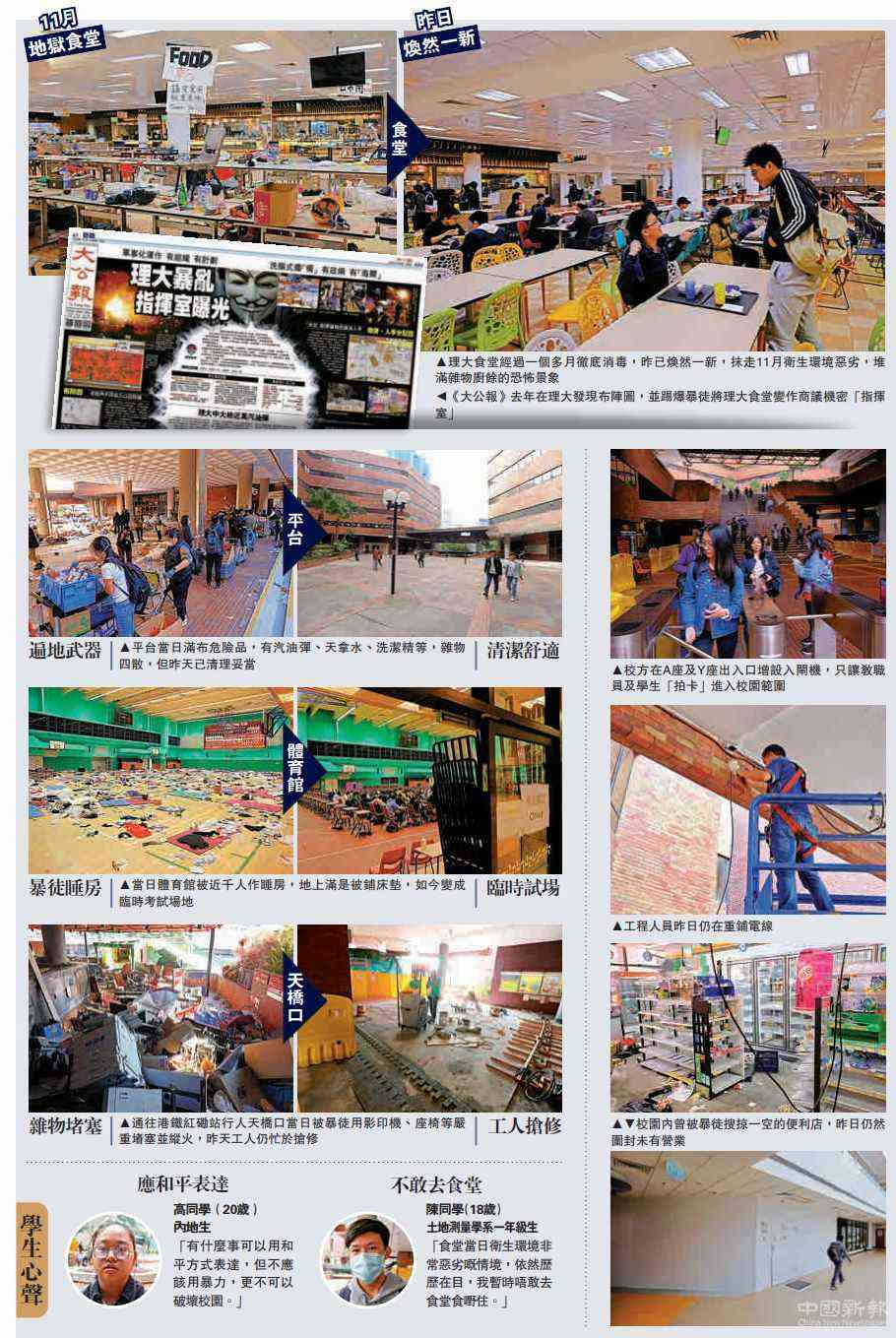理大校園去年11月經(jīng)歷暴劫,損毀嚴(yán)重,校方經(jīng)一個(gè)多月“快速”修補(bǔ),終趕及昨日第二學(xué)期開學(xué)重開,不過校方稱雖有九成地方恢復(fù)使用,但通往A座及G座通道、泳池、連接Z座天橋、圖書館一至三樓、所有對(duì)外天橋,以及個(gè)別商戶仍然未能重開。過往開放的校園,現(xiàn)時(shí)出入受限,校方在A及Y座出入口設(shè)入閘機(jī),只讓教職員及學(xué)生進(jìn)入校園,其他人士須預(yù)先登記。