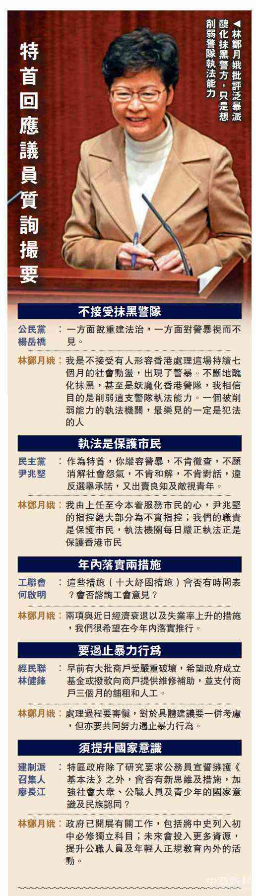 民主黨尹兆堅聲言,林鄭月娥沒有回應“五大訴求”,濫權濫捕,而警察不是保護市民云云。林鄭月娥表示,由上任至現(xiàn)在都是本著服務市民的心,而尹兆堅提出很多不實的指控。