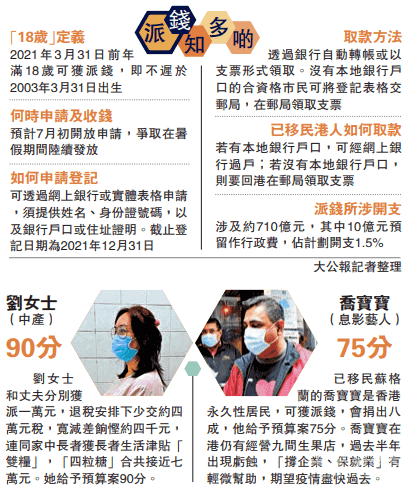 新一份財(cái)政預(yù)算案昨日出爐,于“疫”境中“大開(kāi)水喉”,推出逾1200億港元的一次性“派糖”紓困措施,較去年增加近兩倍,當(dāng)中包括向所有年滿18歲的香港永久性居民每人派發(fā)一萬(wàn)元,爭(zhēng)取在暑假期間發(fā)放;亦有寬減百分之百的薪俸稅、個(gè)人入息課稅、利得稅以及寬免住宅物業(yè)全年差餉等措施。財(cái)政司司長(zhǎng)陳茂波表示,有關(guān)措施是為了回應(yīng)市民期望,與市民共渡時(shí)艱。市民普遍對(duì)預(yù)算案表示贊賞,認(rèn)為可有效紓困,提振經(jīng)濟(jì)。\大公報(bào)記者 文軒 莊恭誠(chéng)
