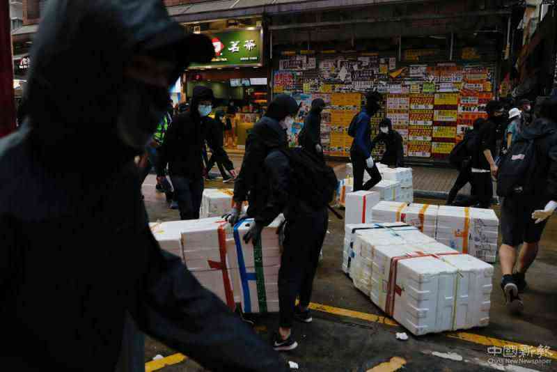 圖:香港疫情剛有緩和,亂港派的“暴力攬炒”又死灰復(fù)燃。圖為黑衣人昨晚在旺角堵路\路透社