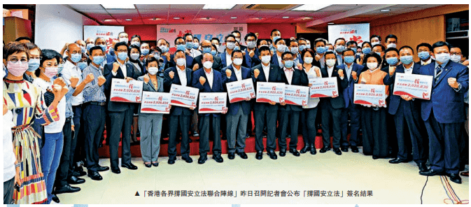 香港各界撐國安立法聯(lián)合陣線由全國人大常委會(huì)委員譚耀宗等13位召集人共同發(fā)起組建。5月24日至31日,聯(lián)合陣線在全港開展為期8天的“撐國安立法”簽名行動(dòng),開設(shè)5400余個(gè)街站,收集街頭簽名1839590個(gè)、網(wǎng)絡(luò)簽名1089246個(gè),簽名總數(shù)為2928836個(gè)。