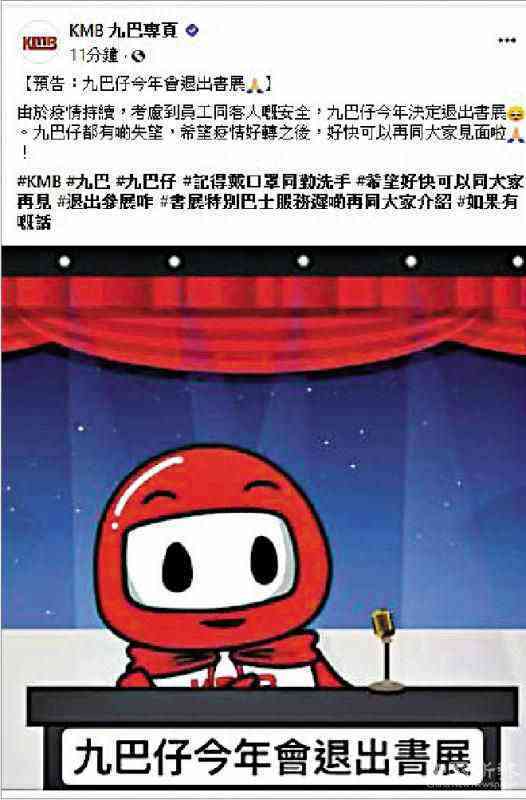 有份參展的九巴,昨日下午透過(guò)社交網(wǎng)站平臺(tái)宣布,由於疫情持續(xù),考慮到員工和客人的安全后,主動(dòng)退出書(shū)展。