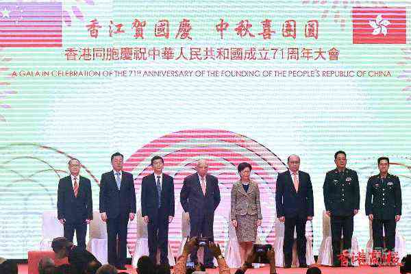 「香江賀國慶 中秋喜團(tuán)圓」——香港同胞慶祝中華人民共和國成立71周年大會(huì),今日(30日)於香港會(huì)展中心隆重舉行。全國政協(xié)副主席、香港同胞慶祝國慶籌委會(huì)主席董建華,香港特別行政區(qū)行政長官林鄭月娥,中央政府駐港聯(lián)絡(luò)辦主任駱惠寧,中央政府駐港維護(hù)國家安全公署署長鄭雁雄,外交部駐港特派員公署特派員謝鋒,中國人民解放軍駐香港部隊(duì)司令員陳道祥、政治委員蔡永中,香港同胞慶祝國慶籌備委員會(huì)秘書長、香港中華總商會(huì)會(huì)長蔡冠深等擔(dān)任主禮嘉賓,與600多位社會(huì)各界人士一起欣賞精彩演出,同賀國慶,共同迎接中秋佳節(jié)。