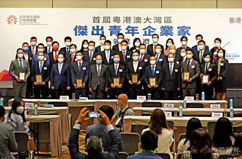 圖:“首屆粵港澳大灣區(qū)杰出青年企業(yè)家”頒獎禮在港深澳三地同步舉行。圖為香港特區(qū)政務司司長張建宗(前排左五)、中聯(lián)辦副主任譚鐵牛(前排左三)、粵港澳大灣區(qū)企業(yè)家聯(lián)盟創(chuàng)會主席蔡冠深(前排右三)等嘉賓在香港會場與香港得獎者合照\中新社