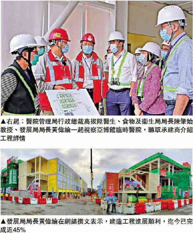 【大公報(bào)訊】記者陳詠韶報(bào)道:為應(yīng)對(duì)可能出現(xiàn)的新一波疫情,香港特區(qū)政府在中央支持下,九月開(kāi)始於亞洲國(guó)際博覽館旁興建可提供超過(guò)800張負(fù)氣壓病床和相關(guān)醫(yī)療設(shè)施的臨時(shí)醫(yī)院。發(fā)展局局長(zhǎng)黃偉綸昨日在網(wǎng)志撰文表示,建造工程進(jìn)展順利,迄今已完成近45%,可望本月底平頂,明年一月內(nèi)完成。