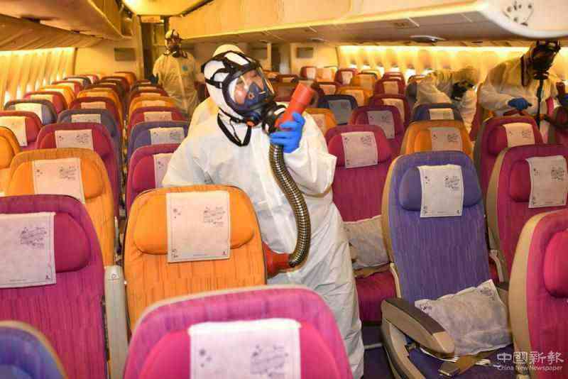 圖:泰航工作人員對機艙內(nèi)部進行消毒/法新社