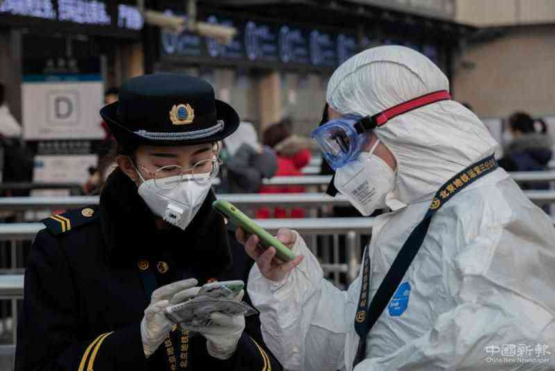 圖:身穿防護(hù)服的安保人員(右)在北京地鐵站與戴口罩的地鐵工作人員交談\法新社