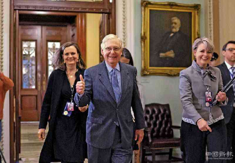 圖:參議院多數(shù)黨領(lǐng)袖麥康奈爾1月31日離開議事廳時豎起大拇指\美聯(lián)社