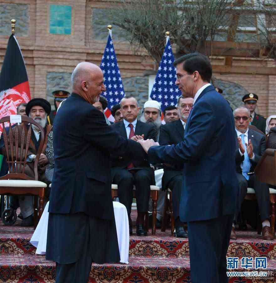 2月29日,在阿富汗首都喀布爾,美國(guó)國(guó)防部長(zhǎng)馬克·埃斯珀(前右)在新聞發(fā)布會(huì)上與阿富汗總統(tǒng)阿什拉夫·加尼握手。新華社發(fā)(拉赫馬圖拉·阿里扎達(dá) 攝)