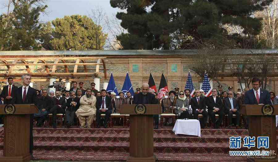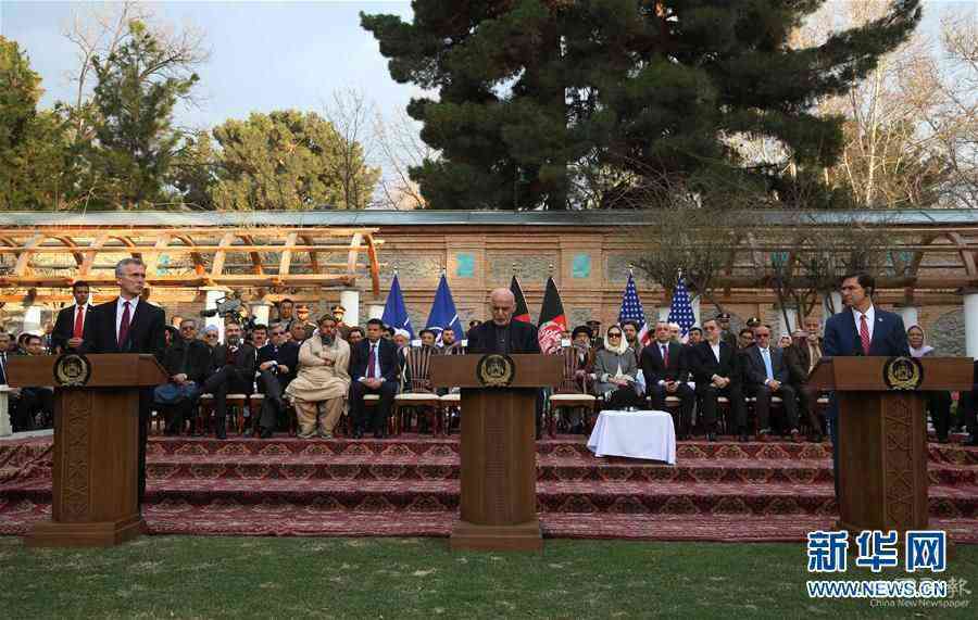 2月29日,在阿富汗首都喀布爾,美國(guó)國(guó)防部長(zhǎng)馬克·埃斯珀(前右)、阿富汗總統(tǒng)阿什拉夫·加尼(前中)和北約秘書(shū)長(zhǎng)延斯·斯托爾滕貝格在新聞發(fā)布會(huì)上。 新華社發(fā)(拉赫馬圖拉·阿里扎達(dá) 攝)