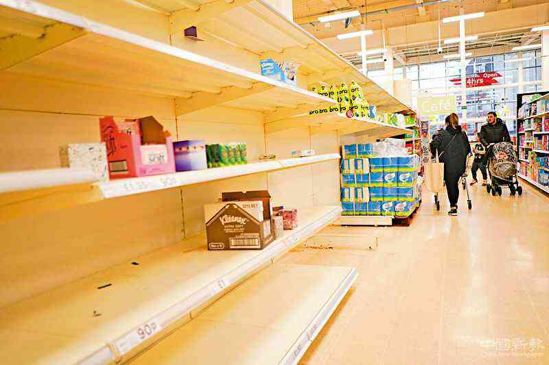 資料圖:英國民眾為應(yīng)對疫情搶購物資,倫敦一間超市的廁紙貨架被搶空\路透社