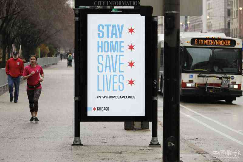 圖:美國芝加哥廣告牌上寫著“居家隔離,挽救生命”的標(biāo)語\美聯(lián)社