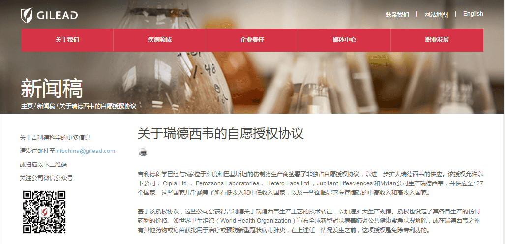 5月13日,吉利德科學(xué)在官網(wǎng)公布了“關(guān)于瑞德西韋的自愿授權(quán)協(xié)議”。協(xié)議內(nèi)容顯示,吉利德科學(xué)已經(jīng)與5家位于印度和巴基斯坦的仿制藥生產(chǎn)商簽署了非獨(dú)占自愿授權(quán)協(xié)議,以進(jìn)一步擴(kuò)大瑞德西韋的供應(yīng)。該授權(quán)允許以下公司: Cipla Ltd., Ferozsons Laboratories, Hetero Labs Ltd.,Jubilant Lifesciences 和Mylan公司生產(chǎn)瑞德西韋,并供應(yīng)至127個(gè)國家。這些國家?guī)缀鹾w了所有低收入和中低收入國家,以及一些面臨顯著醫(yī)療障礙的中高收入和高收入國家。