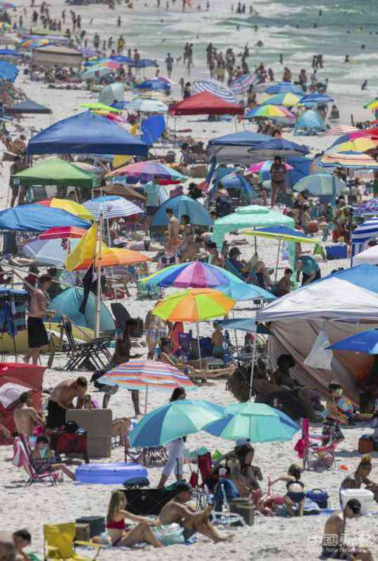 圖:佛州一處海灘23日擠滿無視社交距離規(guī)定的遊人\美聯(lián)社