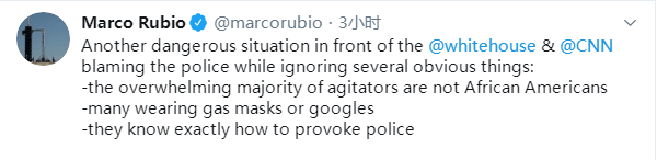 他為美國警察辯護(hù),“指責(zé)警察的媒體忽略了一些明顯的事情:絕大多數(shù)鼓動(dòng)者不是非裔美國人;許多人還戴著防毒面具或眼鏡;他們知道如何激怒警察。”