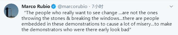 他還稱,“要通過任何合法手段制止無政府狀態(tài)、暴力與騷亂。”他的推文下,不乏美國網(wǎng)友質(zhì)疑“你為什么一邊支持香港所謂的示威者,一邊和特朗普一起強(qiáng)硬對(duì)待美國示威者?”也許,在盧比奧之流看來,只有在美國發(fā)生的暴力才叫暴力,在美國之外發(fā)生的暴力就是“爭(zhēng)取人權(quán)”吧。
