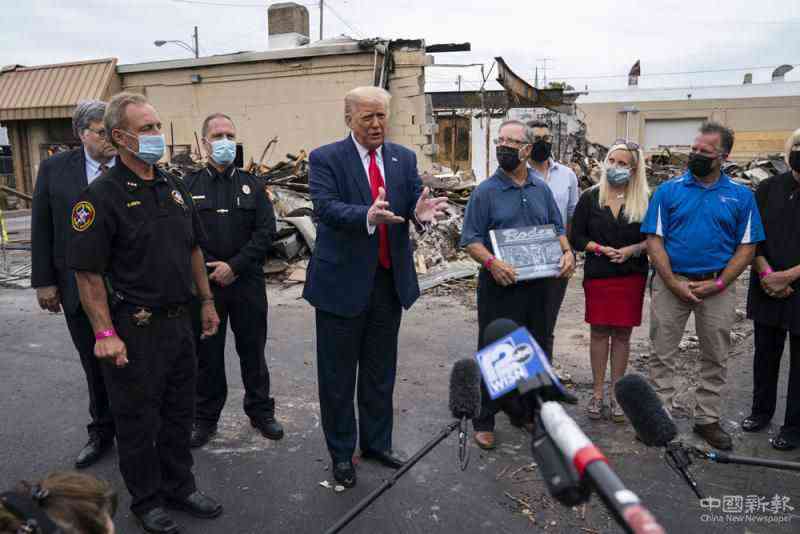 圖:美國(guó)總統(tǒng)特朗普1日到訪基諾沙市,在示威中損毀的建筑前發(fā)表講話\美聯(lián)社